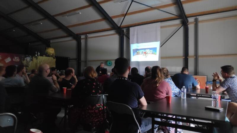Nadat ons spel klaar was, gingen we naar de kantoren van WGG om er een korte rondleiding te volgen. Toch wel indrukwekkend om te zien hoe ze op 12,5 jaar tijd gegroeid zijn van een uit de hand gelopen hobby tot een internationaal bedrijf met 12 werknemers. Ook de inrichting van de kantoren voelt erg warm aan met veel openheid tussen de verschillende compartimenten. Na de rondleiding kwamen we uit in het magazijn waar we onze bestelling konden gaan ophalen. Nadat we alles nageteld en in dozen ingepakt hadden, konden we de auto inladen. Nog even een stukje cake, wat drinken en dag zeggen tegen de nog aanwezige mensen en dan weer aan de lange rit richting Herk beginnen.